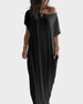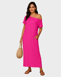 Designed with a chic off-shoulder neckline and relaxed batwing sleeves, this dress offers a roomy, flowy fit with graceful movement. The maxi length skims the body without clinging, while discreet side pockets keep essentials close. Universally flattering, wrinkle-resistant, and easy to pack, it’s perfect for daily wear or vacation getaways.