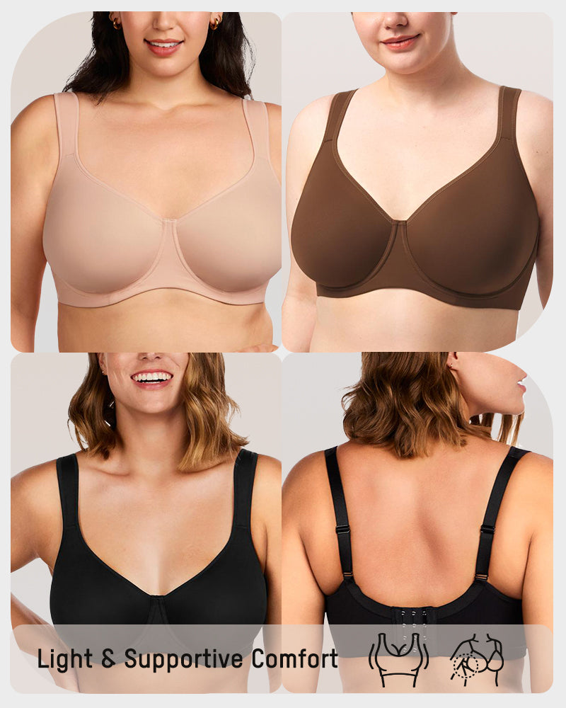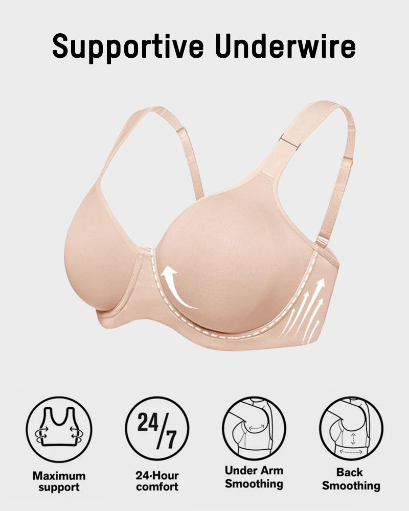 Say goodbye to bra lines & texture showing through tees. This totally smooth minimizer design delivers a sleek, invisible look under any outfit — giving you a clean, polished silhouette from day to night. Higher side wings smooth back and underarm bulges for a flawless finish under clothing.