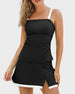 Figure-Enhancing Details – Waist ruching smooths and shapes, while the skirted bottom with side slit adds a playful touch and elongates the legs.
